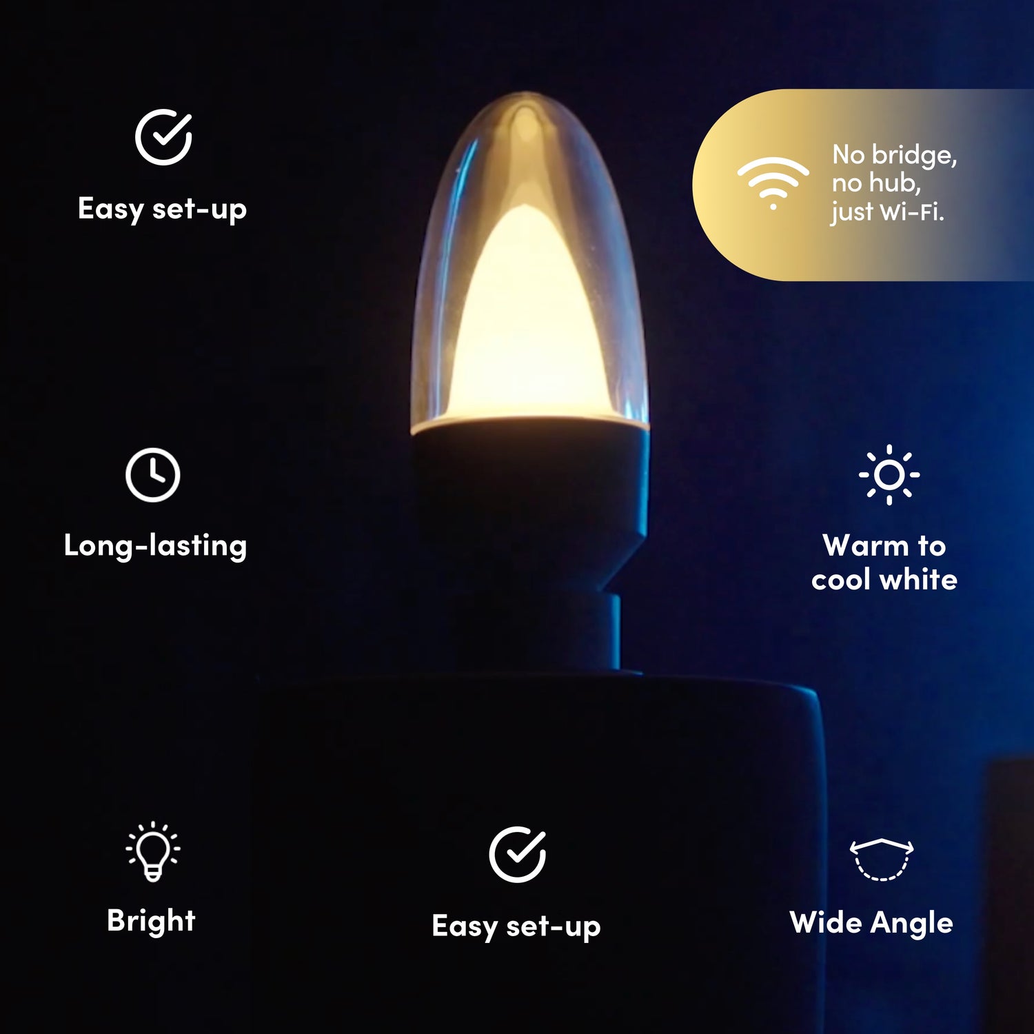 The Candle White to Warm has a huge warm-cool white range (2,200K-6,500K), allowing you to create the perfect light for any occasion. For power users, add endless integrations. Controllable via all leading voice assistants.