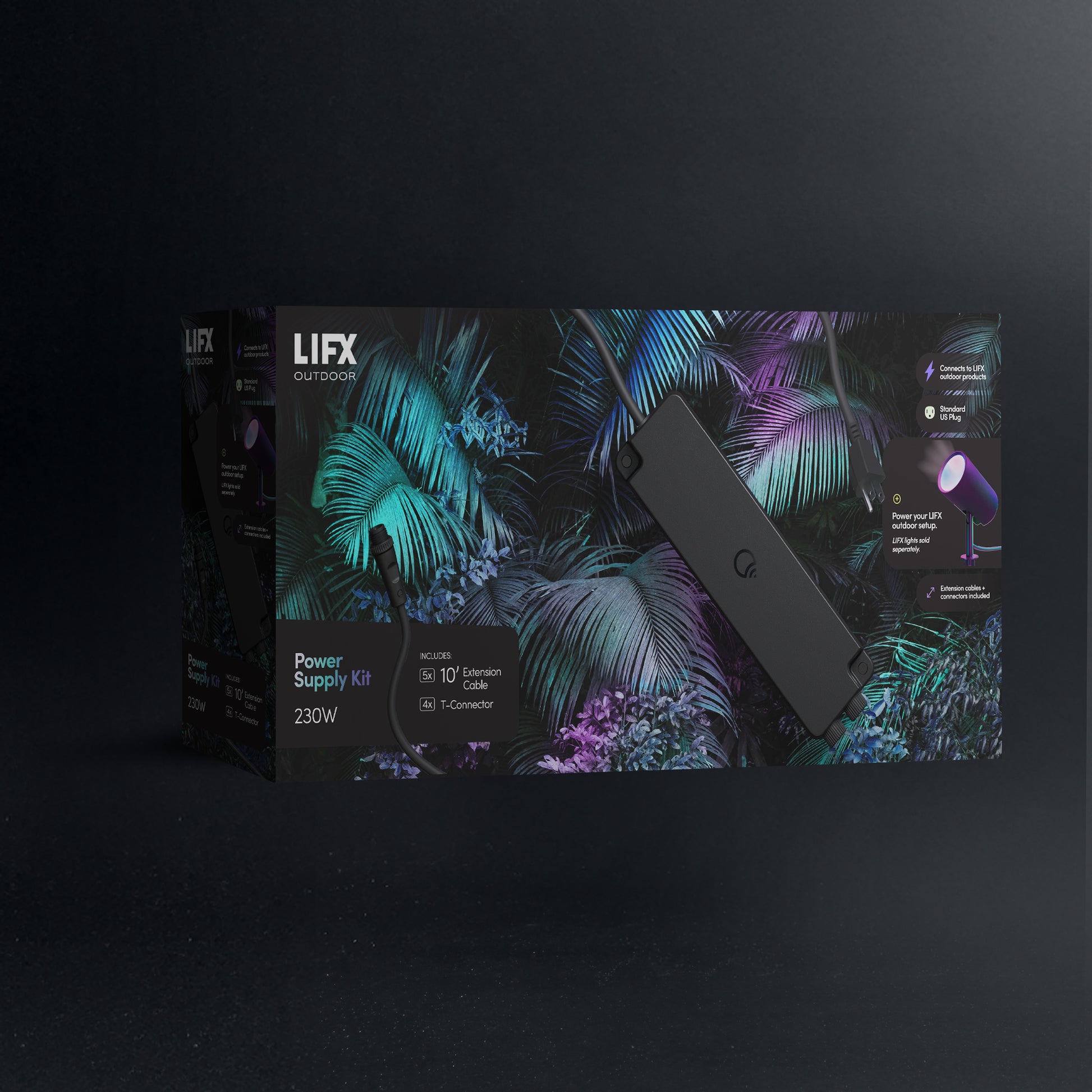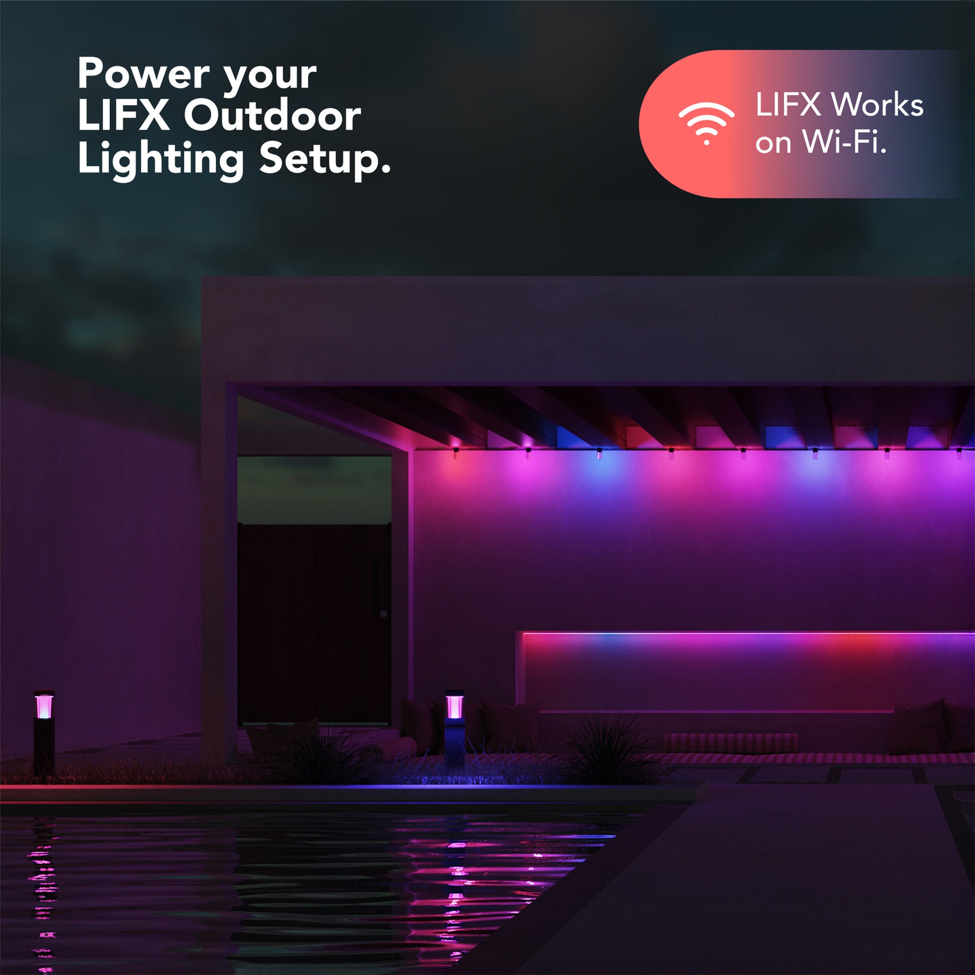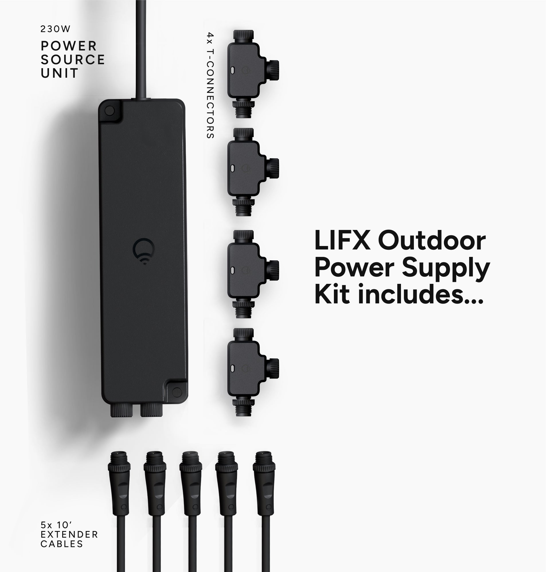 The LIFX Outdoor Landscape Low Voltage Plug-In Power Supply Kit powers your creativity without the need for an existing low voltage system. With two output connectors for longer runs or split directions. Supporting up to eight LIFX Path or Spotlights, it floods your space with vibrant colors, dynamic motion, or warm ambiance. Built to last with weatherproof cabling and a sleek matte black finish, it includes five 10' extension cables and four T-connectors for flexible setups. Control your lights effortlessly with the LIFX app or smart platforms like Google, Apple Home, Alexa, or Samsung SmartThings. Plug in, connect, and let your imagination shine!