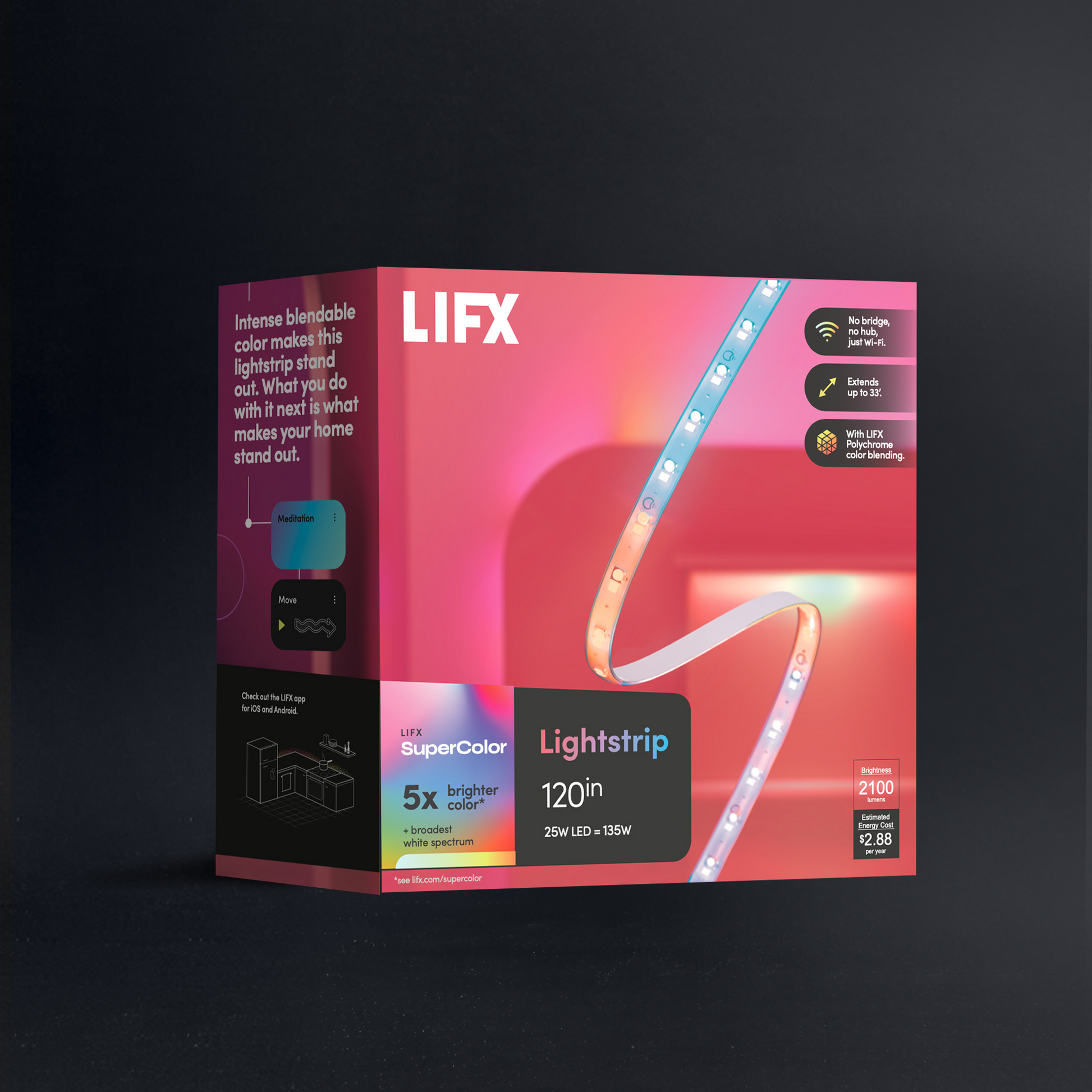 A 120" lightstrip kit with everything you need for larger creative installs behind or under furniture, kitchen islands, cabinetry, and ceilings. With Polychrome Technology, it can display multiple colors at once and animate them along the strip. Cut it to size or extend with LIFX Lightstrip Extensio...