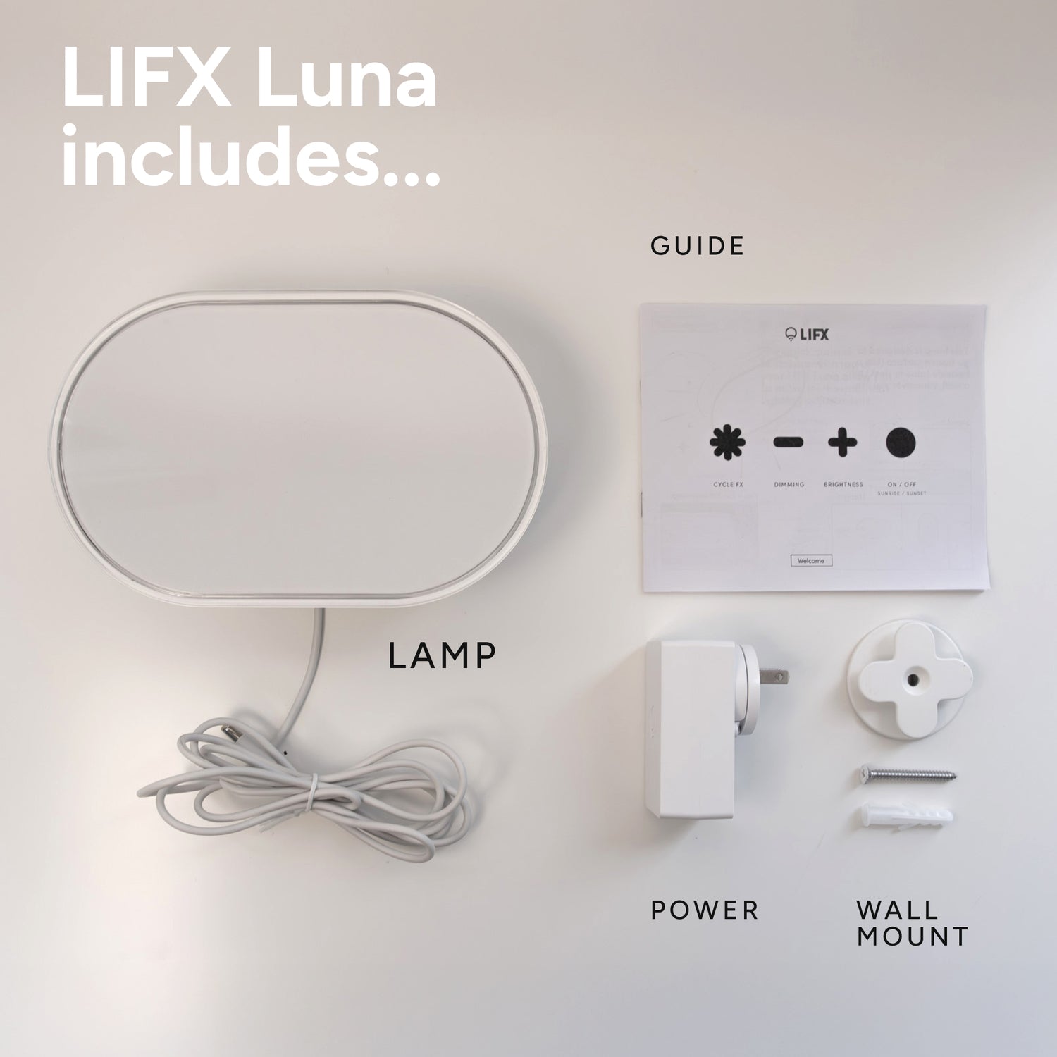 "Your Luna comes with everything you need to get started. Mount it on the wall using the included hardware to turn it into a sleek sconce, or simply plug it in and enjoy it as a standalone lamp.